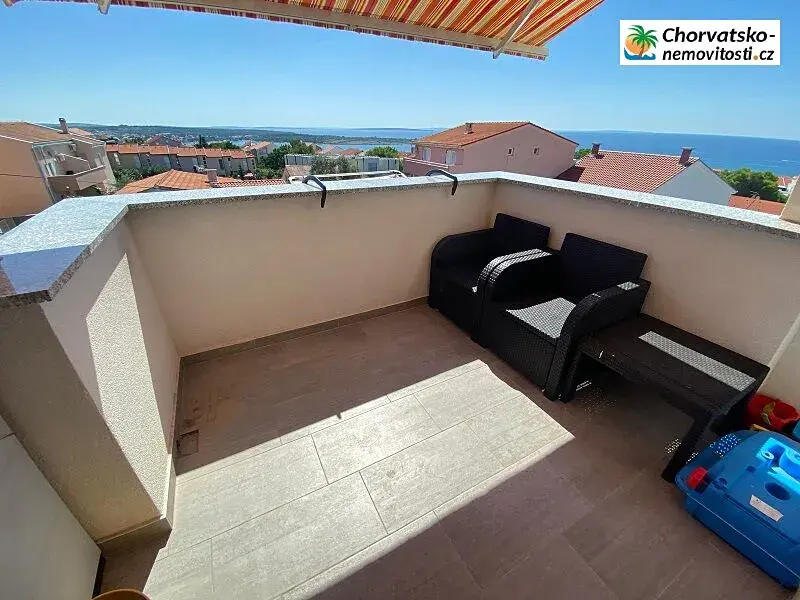 Má lodžii o rozloze 2,22 m2 a terasu o rozloze 4,91 m2 s markýzou a výhledem na moře.