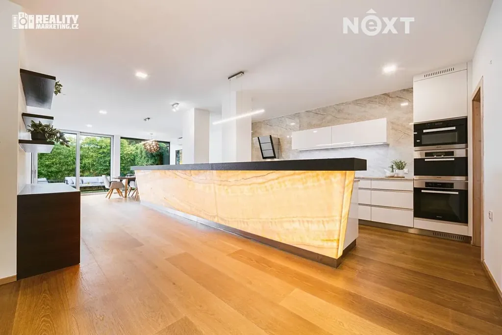 Luxusní kuchyně s mramorem Taj Mahal, podsvíceným onyxem (stejný materiál jako ve vile Tugendhat), žulovým barem, spotřebiči Miele a designovým osvětlením.