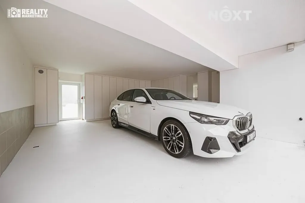 Vyhřívaný příjezd a vstup, dvojgaráž + přístřešek, skladovací prostory.