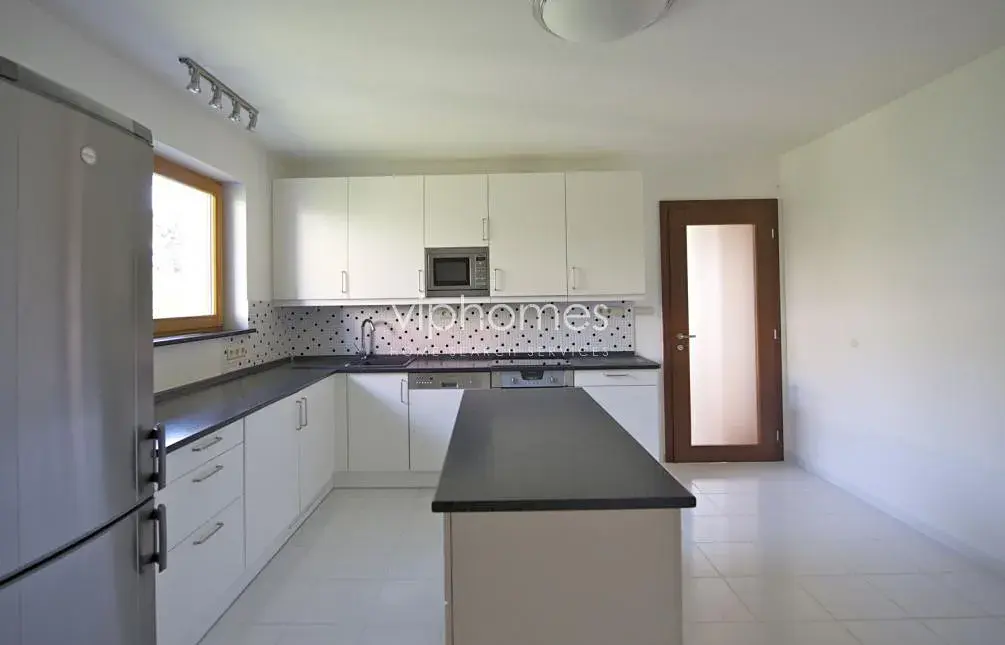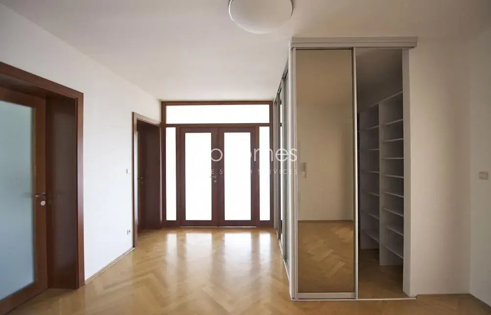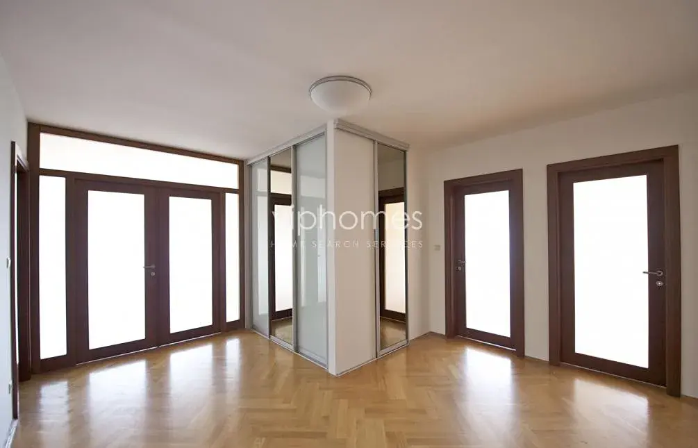Bezpečnostními dveřmi vstoupíte do prostorné předsíně, odkud je možnost vstupu do jednotlivých místností. Bytu dominuje obývací pokoj s přilehlou jídelnou (50 m2), který je orientován na jih a je propojen s rozlehlým balkonem. Samostatná kuchyň (se špízí) disponuje kompletně vybavenou kuchyňskou linkou (lednice, sklo-keramická deska, trouba, myčka, pračka ze sušičkou, mikrovlnná trouba). Dále byt nabízí 3 samostatné ložnice, 2 koupelny, (jedna koupelna sprchový kout a toaleta, další koupelna s vanou), samostatnou toaletu s bidetem a velkou vstupní halu se šatnou. Byt je realizován ve vysokém nadstandardu a to nejen díky vybavení, ale i díky použitým materiálům a značkových zařizovacích předmětů. V bytě jsou dřevěné podlahy a dlažba, bezpečnostní dveře, domácí vrátný. Okna mají nainstalované el. rolety. Parkování pro jeden vůz v garáži v ceně.