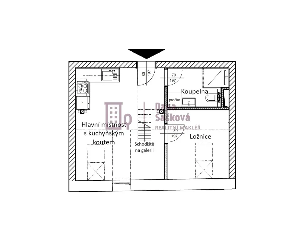 Celková plocha 49 m2 nabízí vstupní chodbu, hlavní místnost s kuchyňským koutem, menší ložnici, koupelnu s toaletou a sprchovým koutem a vyvýšenou galerii o výměře 12 m2, ideální jako prostor na spaní nebo pracovna.