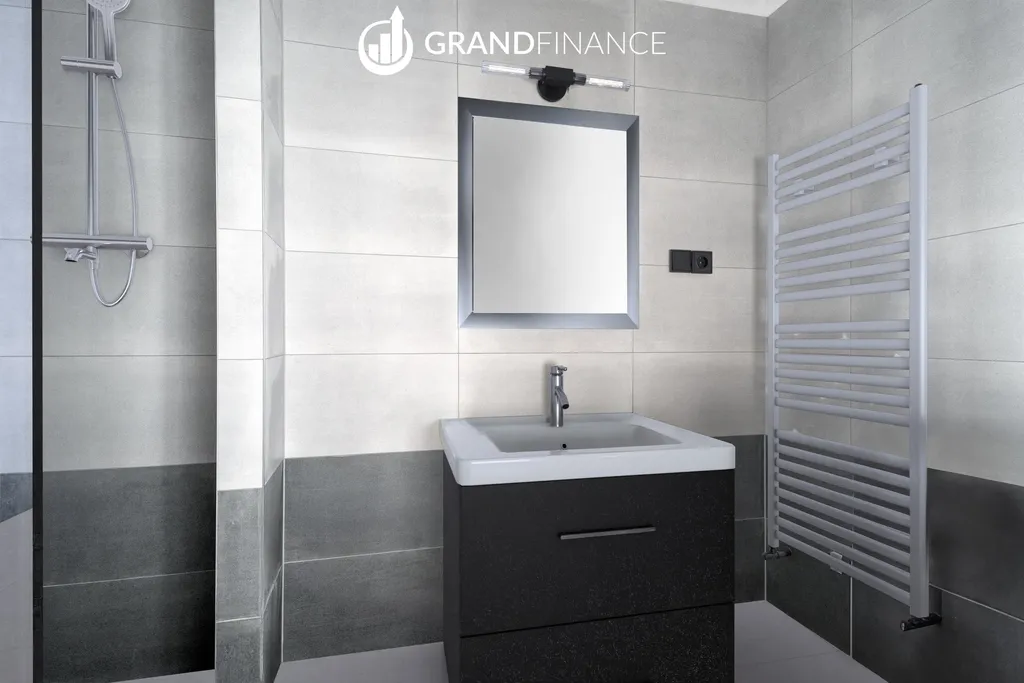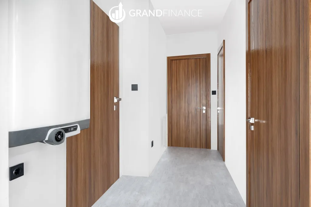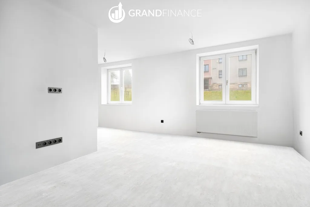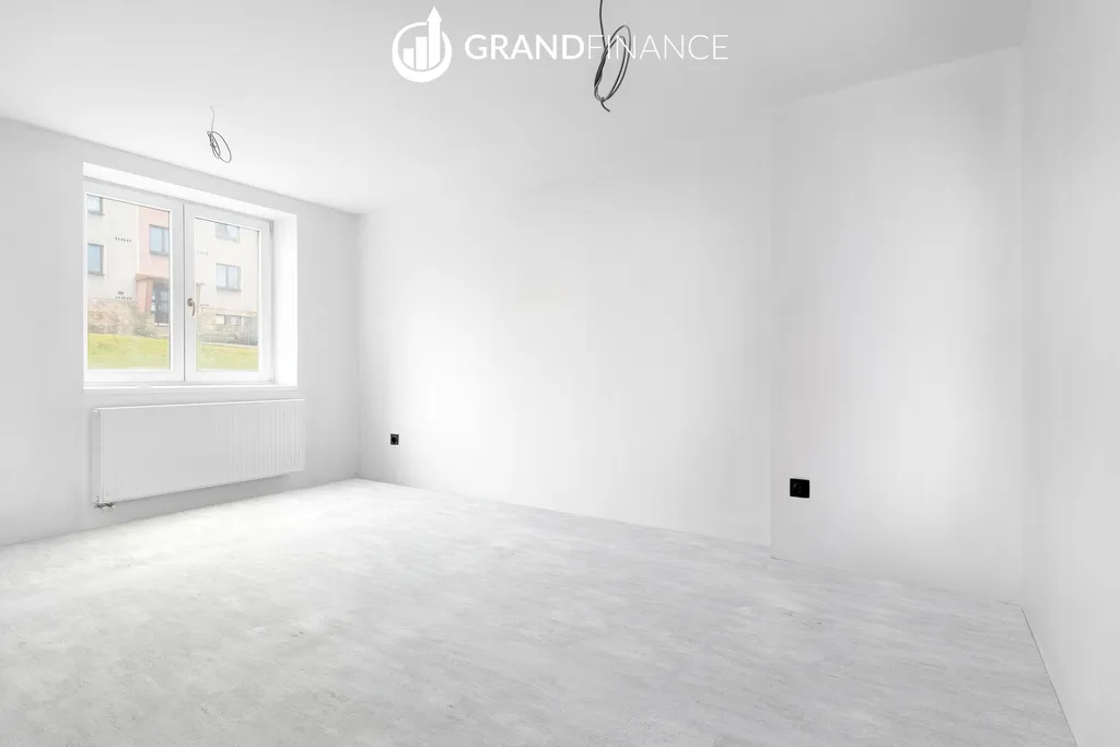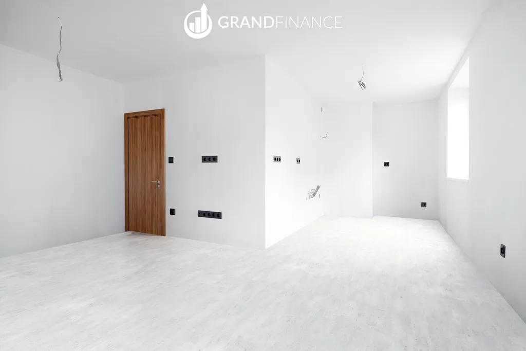 Interiér bytu je řešen v moderních a neutrálních tónech. Kuchyňská linka zatím není instalována, což dává novému majiteli možnost navrhnout si kuchyň přesně podle vlastních představ.