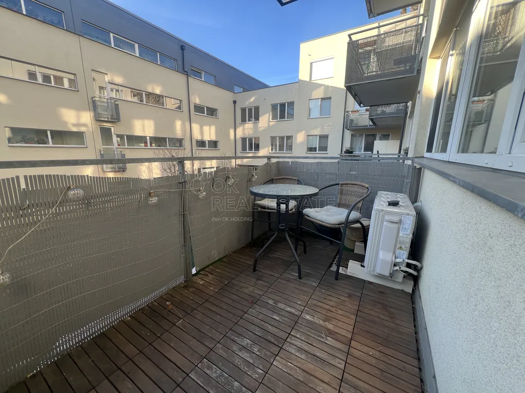 Byt je částečně vybaven a nabízí perfektní zázemí pro jednotlivce i páry. Součástí vybavení je pračka se sušičkou, lednice, myčka i mikrovlnka, byt je mimo to vybavený i potřebným nábytkem. Mezi jeho přednosti patří klimatizace, která zajišťuje příjemné prostředí během teplých letních měsíců. K bytu náleží také balkon, který je přístupný z obývacího pokoje a je situován do klidného vnitrobloku domu. Dále je nájemcům k dispozici také sklep a parkovací stání, které jsou v suterénu bytového domu.