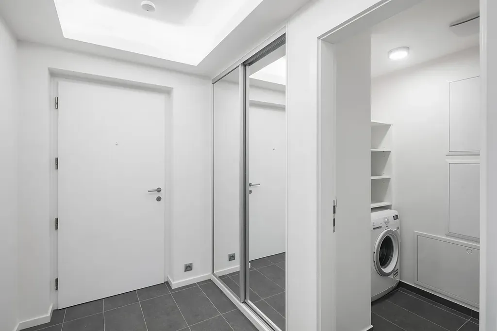 Obývací pokoj je propojen s kuchyní, vestavěná kuchyňská linka je vybavená všemi spotřebiči, včetně myčky nádobí. V ložnici je velká vestavěná skříň. Druhá vestavěná skříň je v předsíni. V koupelně je vana a WC. Technická místnost vybavená pračkou. Z terasy je výhled na řeku Vltavu a velmi originální exteriéry vedlejších domů s hladkou betonovou omítkou od architektonického ateliéru Ian Bryan Architects.