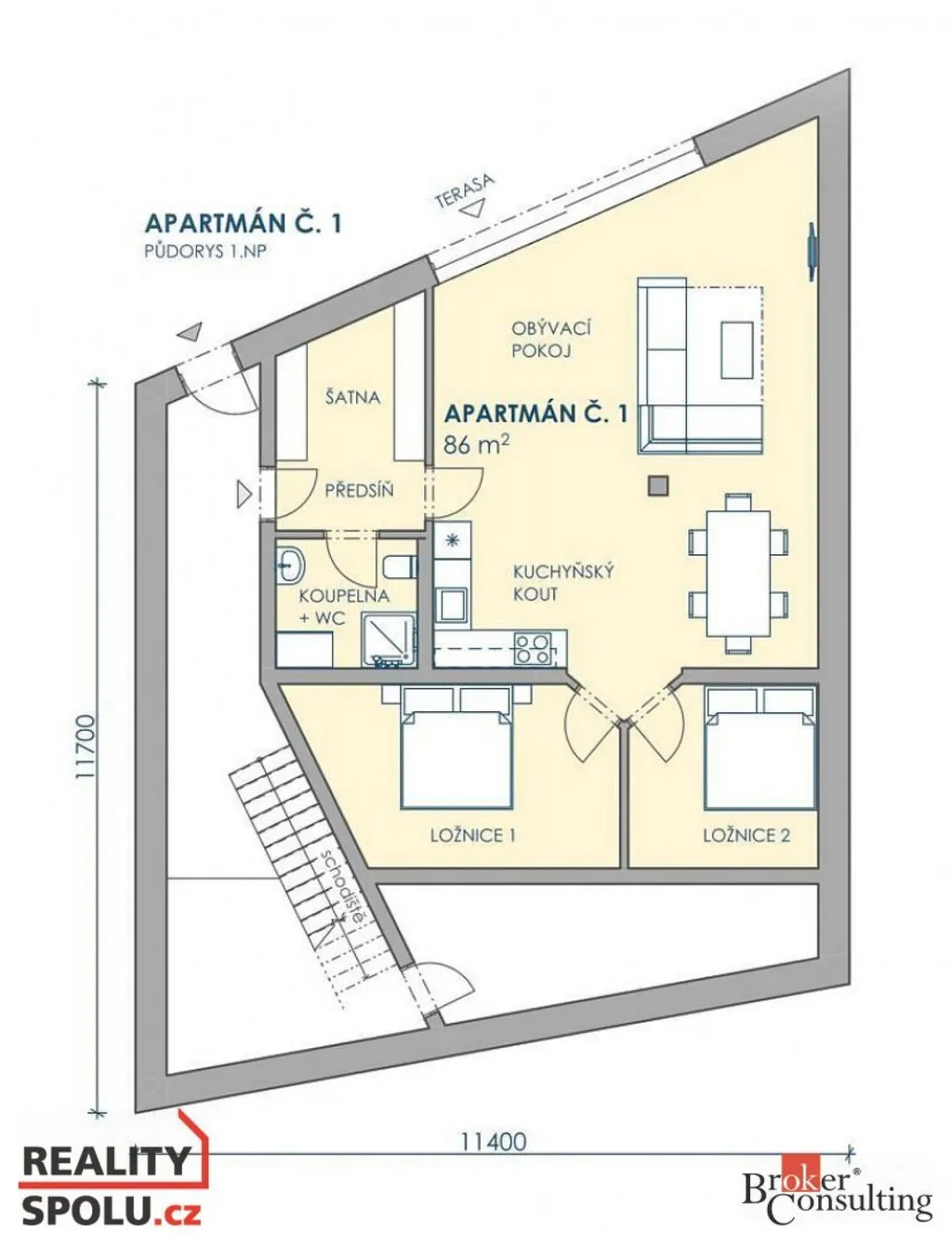 Apartmán I (přízemí): Přímý vstup na terasu s venkovním posezením. K dispozici jsou 2 ložnice (dvoulůžka) a rozkládací gauč (plnohodnotné dvoulůžko) v obývacím pokoji – celkem 6 lůžek. Koupelna se sprchovým koutem a toaletou, kuchyňský kout s jídelnou a obývací pokoj.
