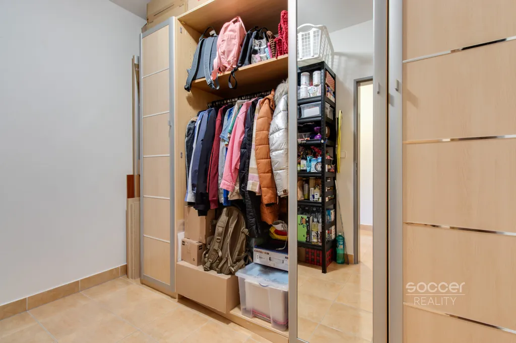 Součástí bytu je také samostatná místnost využívaná jako šatna se skříní, která nabízí dostatek úložného prostoru. Koupelna je vybavena sprchovým koutem a koupelnovým nábytkem, k dispozici je prostor pro pračku. Toaleta je oddělená. K bytu náleží garážové stání v suterénu domu, které zajišťuje pohodlné parkování.