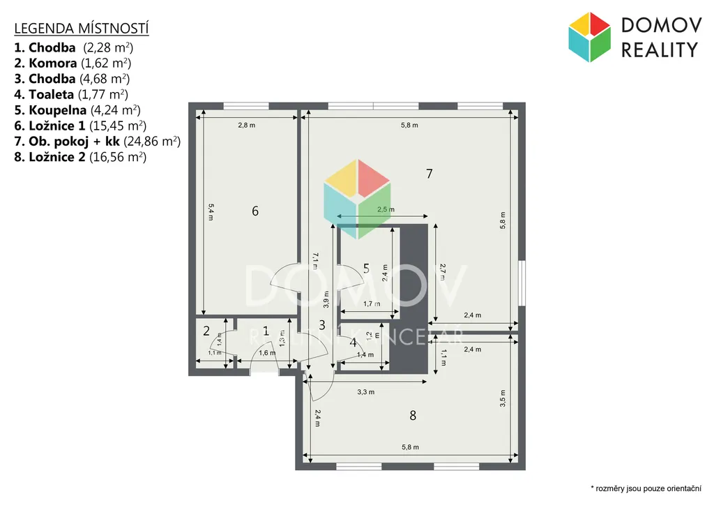 Byt je řešen velmi prakticky včetně úložných prostor - nabízí chodbu, komoru, dva samostatné pokoje a světlý obývací pokoj s kuchyňským koutem, koupelnu se sprchovým koutem a samostatnou toaletu.