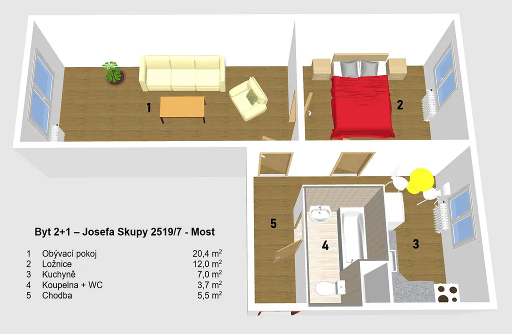 Pronájem bytu 2+1, 49,93 m², Most, Josefa Skupy 2519/7