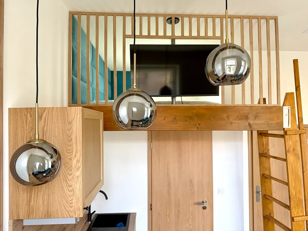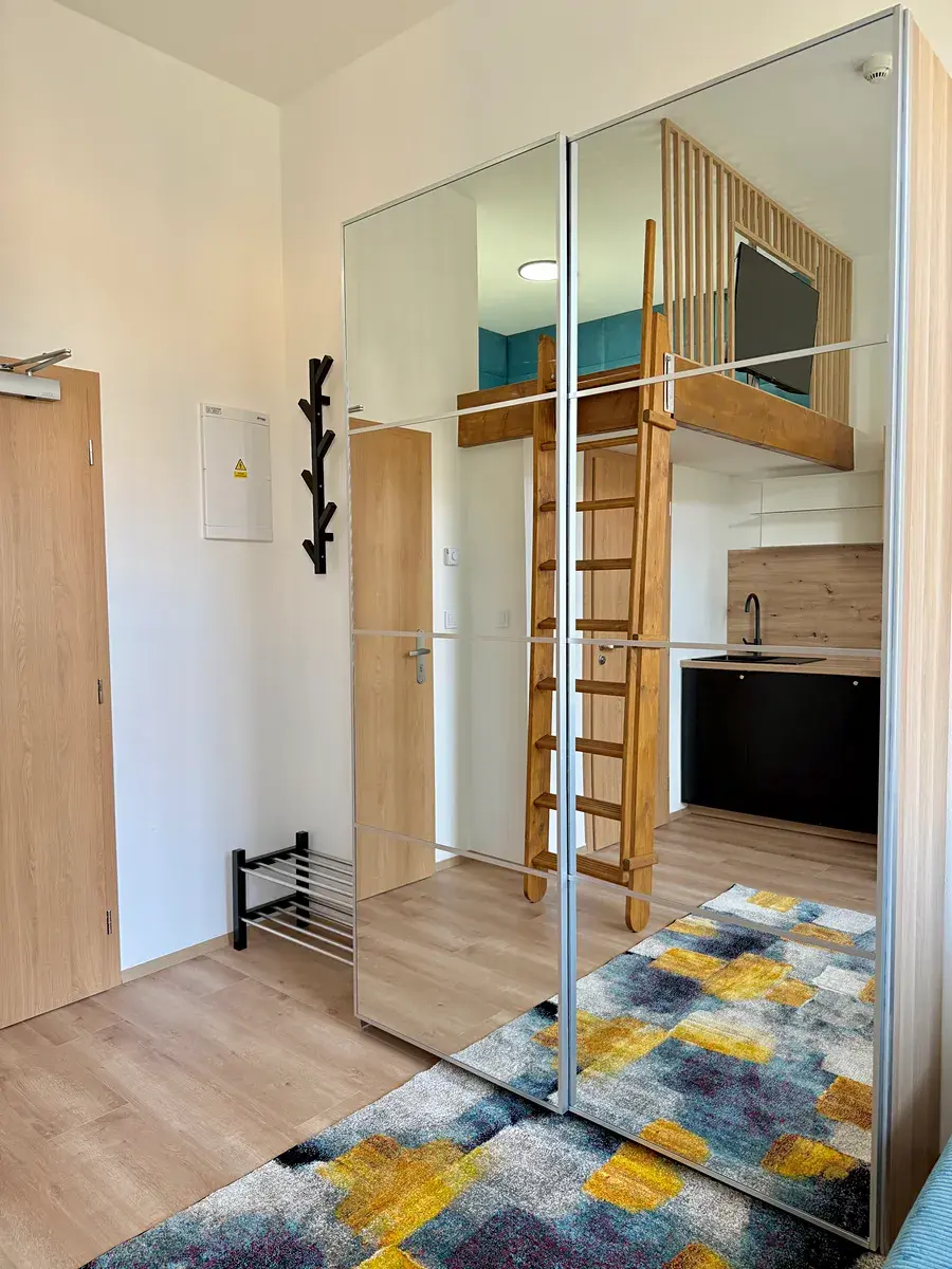 Byt o celkové ploše 22 m² (obytná část 17,2 m² + patro na spaní 5 m²) se nachází ve 4. patře udržovaného činžovního domu po rekonstrukci s výtahem. Součástí nájmu je také sklepní kóje.
