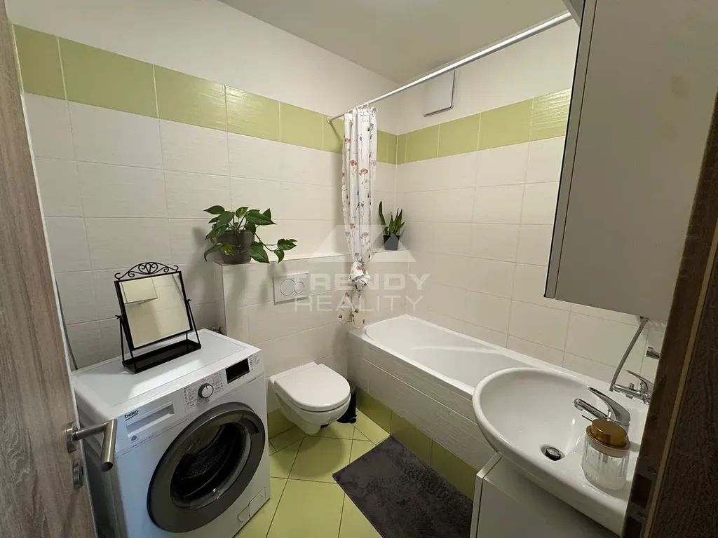 V koupelně se nachází vana, zrcadlová galerka a automatická pračka Beko.