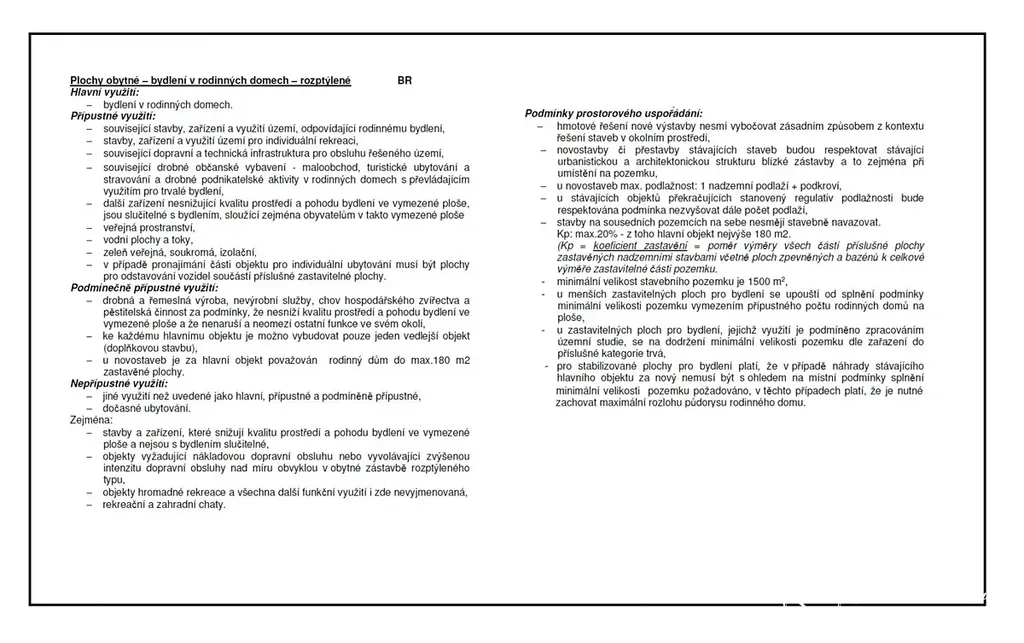 Dle územního plánu je pozemek zařazen do ploch obytných - bydlení v rodinných domech - rozptýlených, určených ke stavbě pro bydlení i rekreaci či kombinaci s podnikáním. Na pozemku možnost výstavby 1 domu, s podlažností 1 NP + obytné podkroví, zastavitelnost max. 20%, z toho hlavní objekt max. 180 m2.