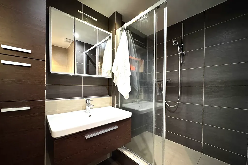 Byt prošel před několika lety kompletní rekonstrukcí. Na podlahách je kombinace dlažby a linolea. K dispozici je kuchyňská linka na míru s vestavěnými spotřebiči, včetně pračky. Koupelna je moderní, se sprchovým koutem a toaletou.