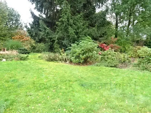 Velká zahrada s okrasnými keři a travnatými porosty.