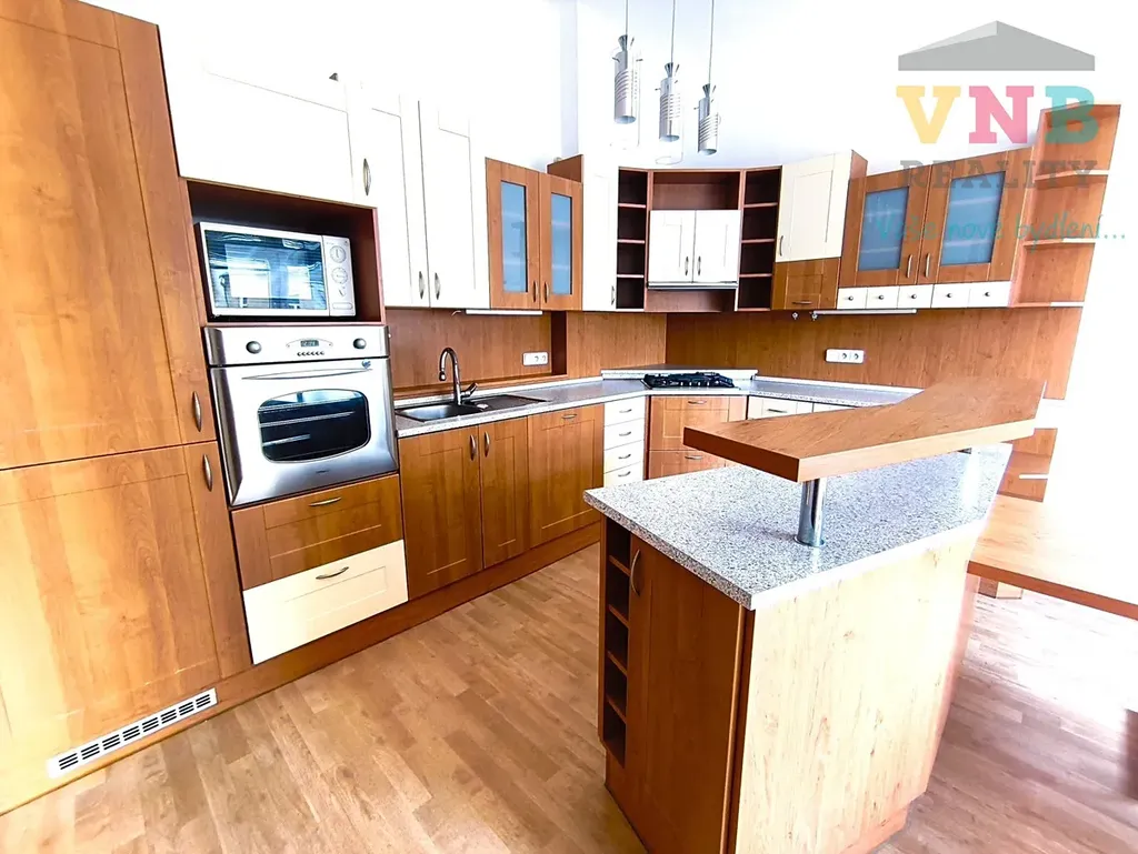 V kuchyni Vás jistě zaujme pěkná kuchyňská linka situovaná do tvaru do L s ostrůvkem vybavená veškerými vestavěnými spotřebiči (lednice s mrazákem, el. trouba, MW trouba, plynová varná deska, digestoř, myčka nádobí). Na ostrůvek navazuje jídelní stůl a ve zbývajícím volném prostoru je umístěna ještě komoda. Součástí kuchyně je i komora.