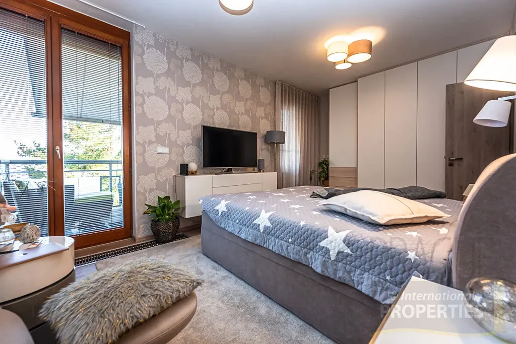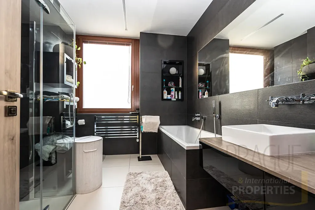 Podlahová plocha bytu je 180m2 a nabízí prostornou vstupní halu s vestavěnými skříněmi , technickou místnost, 4 ložnice, šatnu, 3 koupelny jedna s vanou i sprchovým koutem, sklep a dvě parkovací stání v domě.