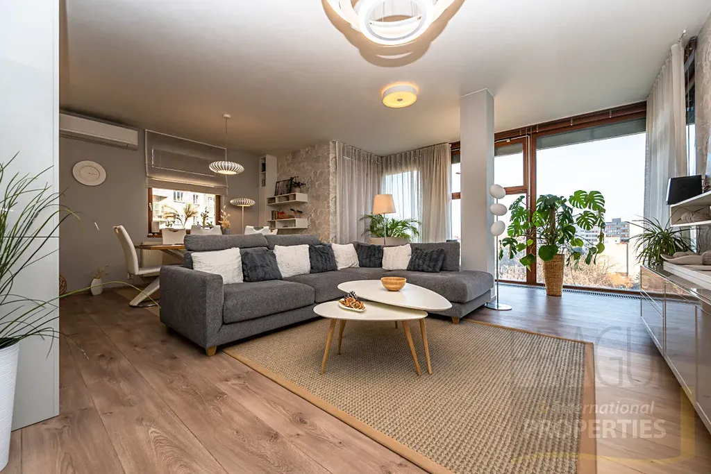 V bytě byly použity velmi kvalitní zařizovací materiály, dřevěné podlahy, elektrické markýzy na terase, kvalitní kuchyňská linka s vestavěnými spotřebiči značky MIele ( trouba, parní trouba atd ), designové osvětlení. Byt je úžasně světlý díky velkoformátovým oknům. Nechybí ani klimatizace.
