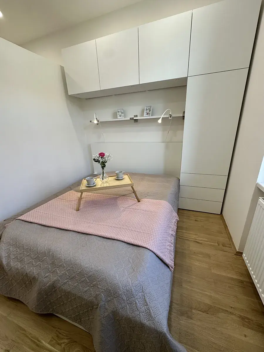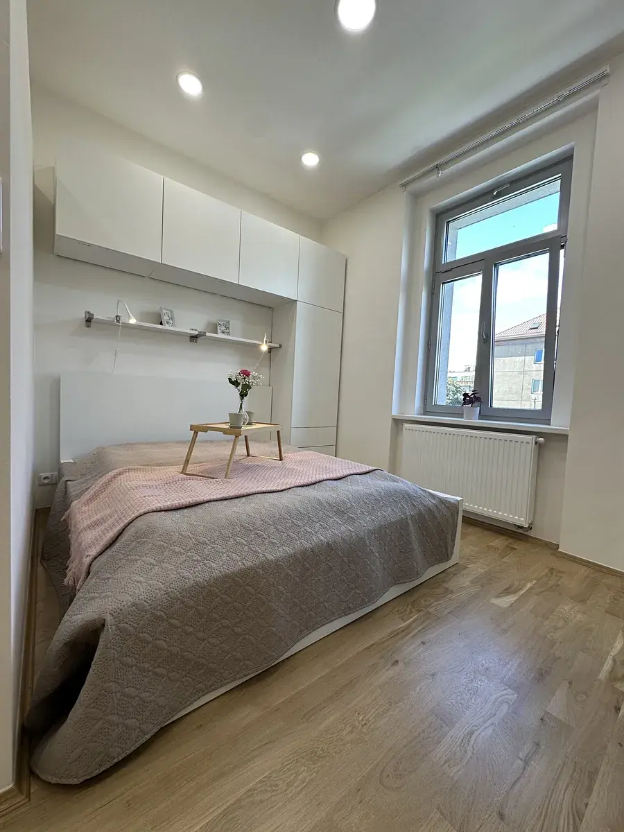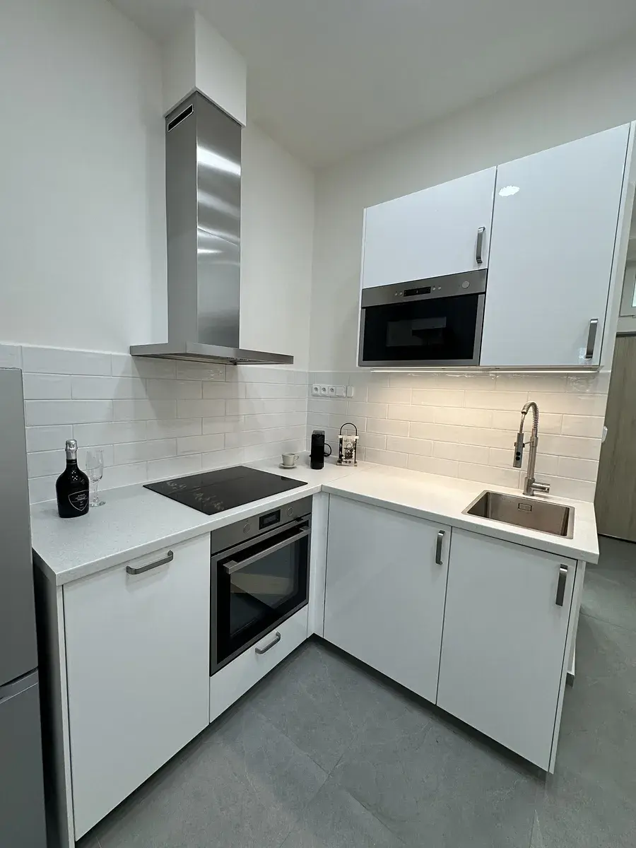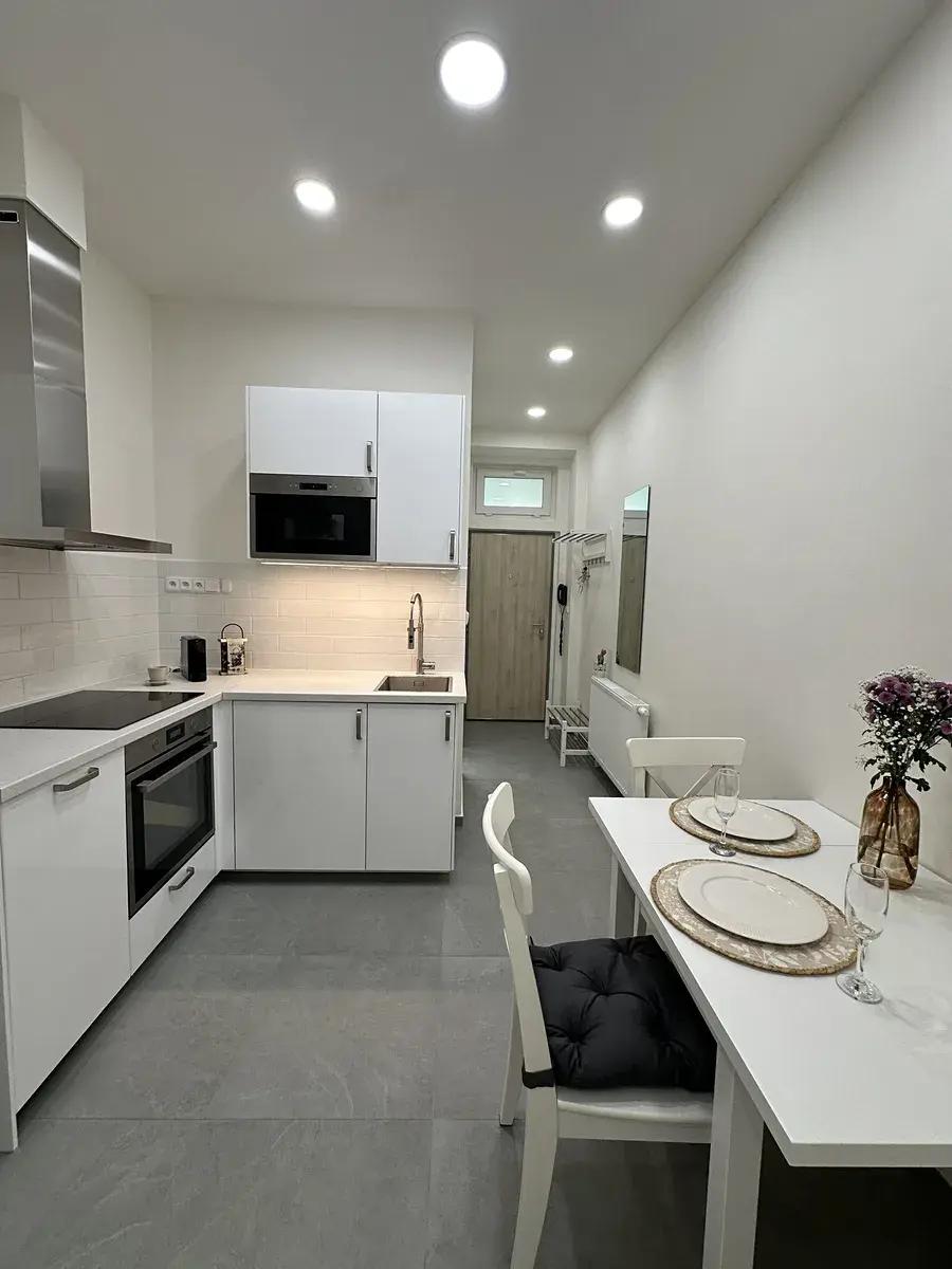 Interiér prošel kompletní rekonstrukcí, při které byly použity kvalitní materiály. Koupelna je vybavena pračkou. V kuchyni najdete novou linku se všemi vestavěnými spotřebiči: lednicí s mrazákem, myčkou, mikrovlnnou troubou, klasickou troubou, digestoří a indukční varnou deskou. Součástí vybavení je také malý jídelní stůl se židlemi a pohovka v obývací části. Spací zóna s manželskou postelí je oddělena příčkou, což zajišťuje více soukromí. Byt je připraven k okamžitému nastěhování.