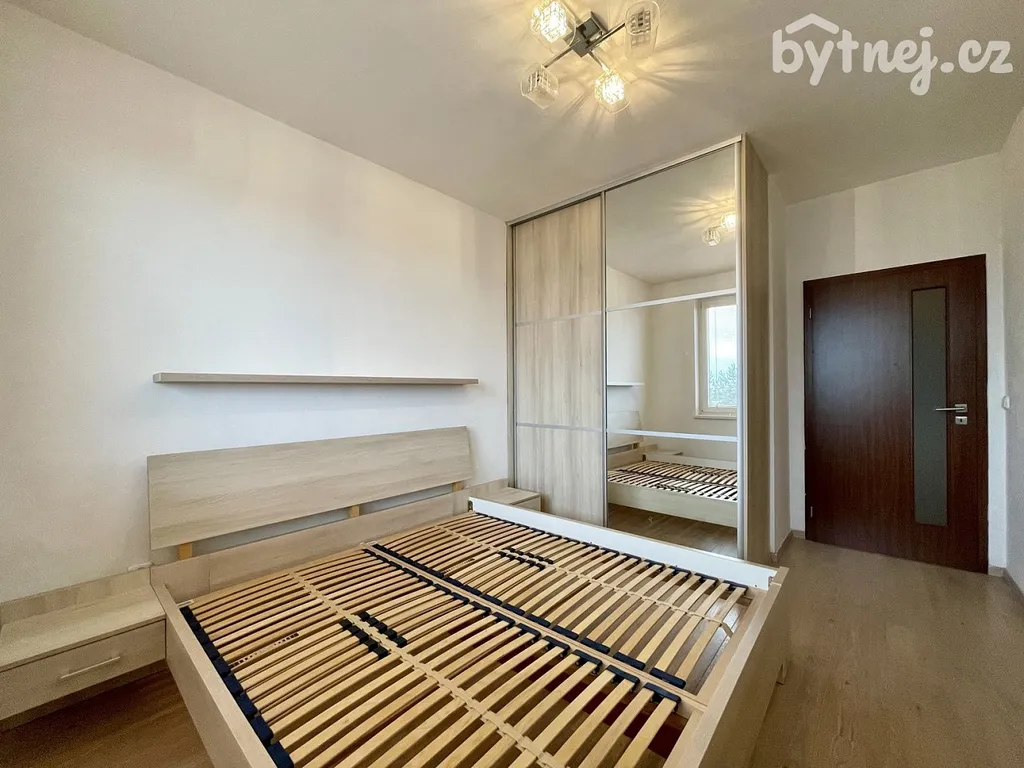 Ložnice je vybavená rámem manželské postele, šatní skříní, komodou, nočními stolky a televizí.