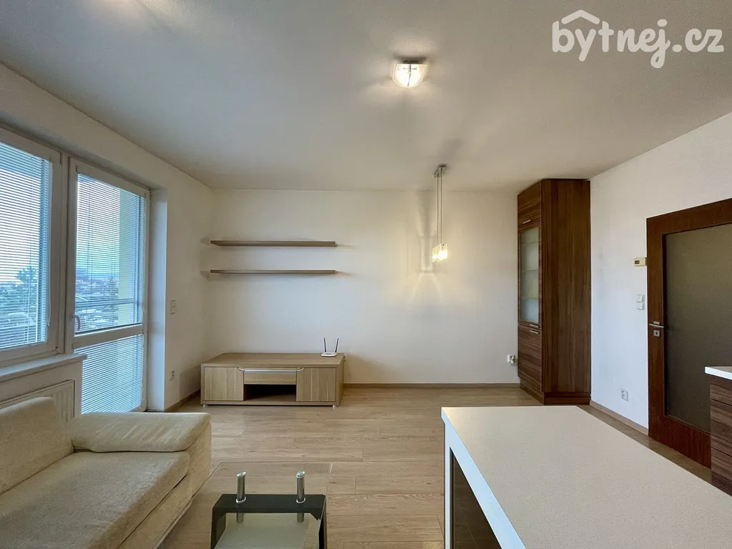 V obývací části se nachází úložný prostor a konferenční stolek. Sedací souprava není součástí. Z pokoje dále vede vstup na balkon.