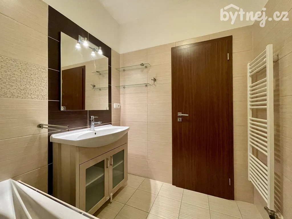 V koupelně je připravená vana, umyvadlová skříňka se zrcadlem a otopný žebřík. Toaleta je samostatná.