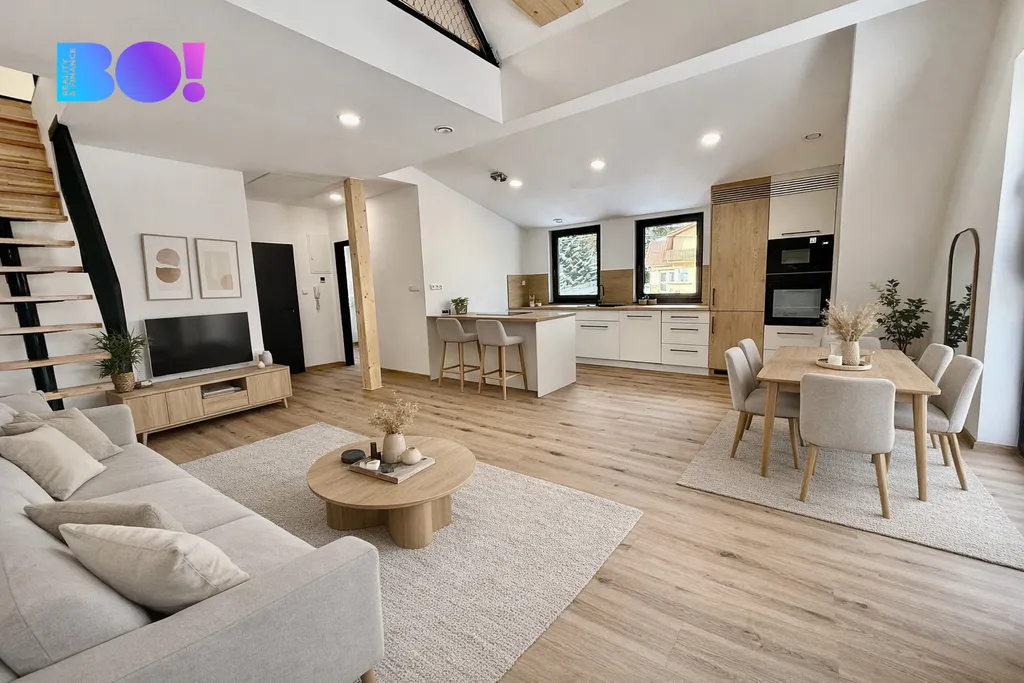 Otevřený obytný prostor působí vzdušně, čistě a přirozeně. Velká okna vpouští dostatek denního světla a podtrhují moderní charakter interiéru. Celek působí harmonicky, nadčasově a velmi příjemně pro každodenní život. Horní část mezonetu nabízí plnohodnotný prostor, který lze využít jako ložnici, pracovnu nebo klidovou zónu.