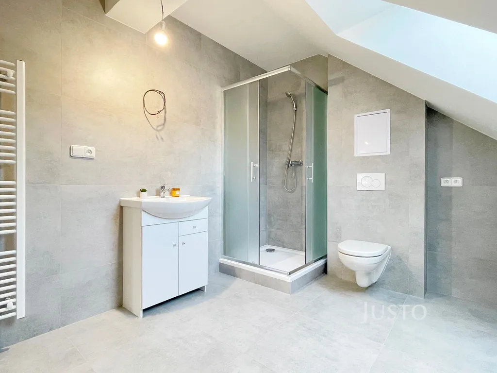 V druhém patře je podkrovní bytová jednotka o dispozici 2+kk. Celková plocha bytu s příslušenstvím bez podlahové plochy svislých konstrukcí je 58,3 m² a se svislými konstrukcemi je 63,6 m².