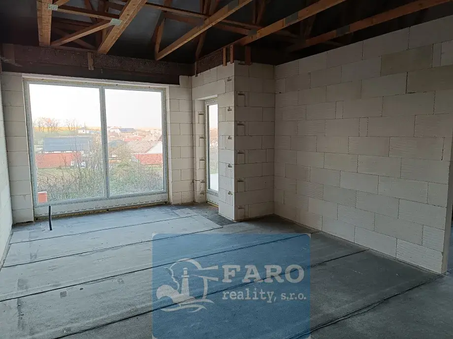 Nabízíme k prodeji rozestavěný rodinný dům v obci Bantice, 10 km od města Znojma. Jedná se polovinu dvojdomku s dispozicí 3+kk a terasou. Uvnitř domu jsou vystavěny příčky, tzn. že vše ostatní si nový majitel udělá dle svých představ. Dispozice: zádveří ze kterého je vstup do technické místnosti, 2x samostatná toaleta s umývadlem, chodba, pokoj, koupelna se sprchovým koutem, ložnice a obývací pokoj s kuchyňským koutem a vstupem na terasu (16 m2). Do domu je zavedena elektřina (zatím základní tarif), kanalizace, obecní vodovod. Vytápění domu je dle projektu plánováno tepelným čerpadlem + krb bez výměníku. Od druhé poloviny dvojdomu je zahrada oddělená betonovým plotem. Obytná plocha je 78 m2. Pozemek má 370 m2. Odhad dokončovacích prací (včetně materiálů) je cca 1,4 mil. Prodávají je schopen zajistit firmy a řemesla na úplné dokončení domu. Uvedená cena je včetně provize.