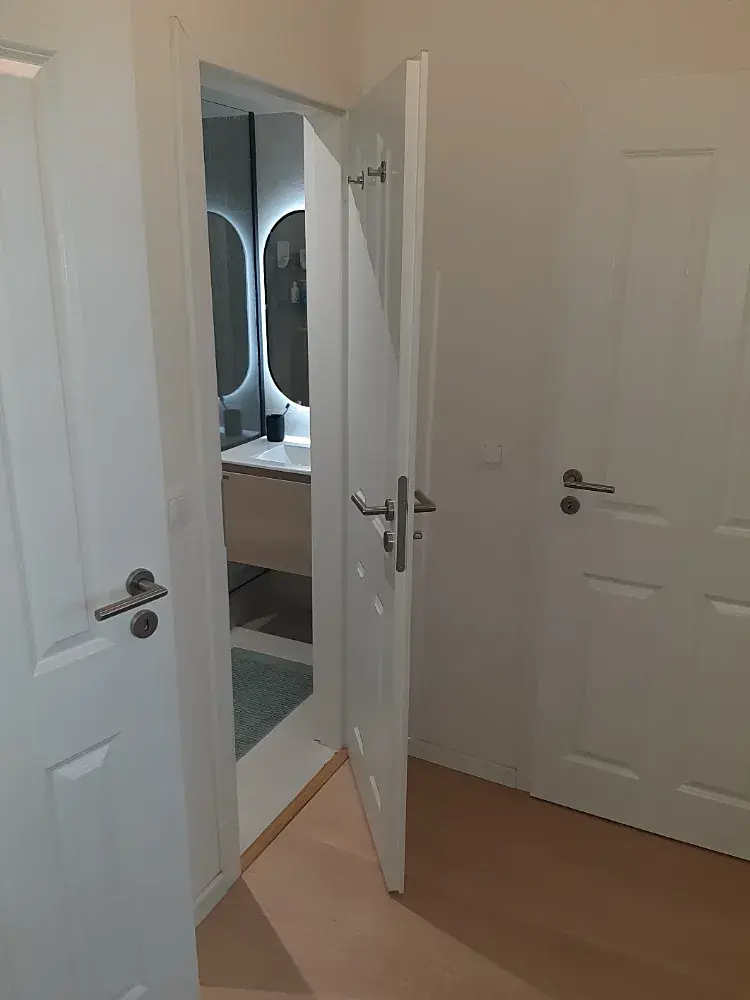 V koupelně je prostorný sprchový kout a umyvadlo. WC je v bytě samostatně. V bytě je dále komora sloužící jako technická místnost pro automatickou pračku. Na podlahách jsou laminátové plovoucí podlahy a v koupelně a na WC je dlažba. Vytápění a ohřev teplé vody je centrální.