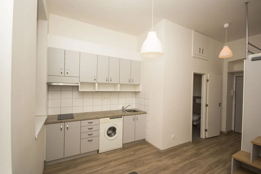 Byt je dispozičně řešen jako 1+kk se spaním v patře, čímž je efektivně využit obytný prostor. V koupelně se nachází sprchový kout a toaleta. Kuchyňský kout je vybaven základními spotřebiči lednicí, mikrovlnnou troubou a varnou deskou. K dispozici je také pračka a sušička na prádlo. Podlahy jsou kombinací plovoucí podlahy a dlažby.