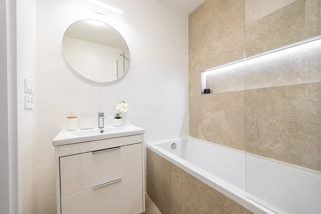 Dominantou bytu je velkorysá kuchyně na míru vybavena spotřebiči (elektrická trouba, mikrovlnná trouba, indukční deska, myčka nádobí) společně s jídelnou. Prostorný obývací pokoj může tak sloužit primárně pro společné chvíle se spoustou místa. Koupelna je řešena velmi velkoryse – nabízí vanu se skleněnou sprchovou zástěnou, elegantní topný žebřík i designové umyvadlo se skříňkou. Praktickým bonusem bytu je spousta místa pro skříně.