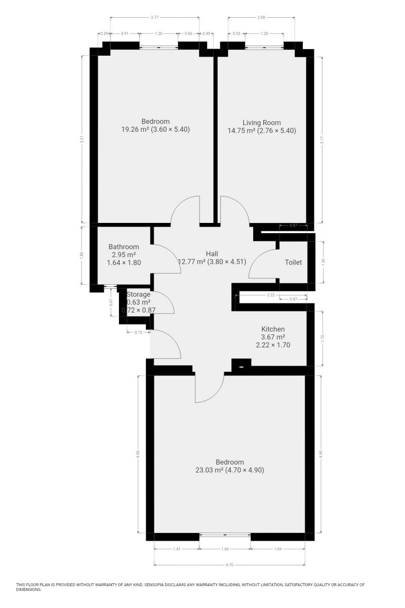 Skládá se ze vstupní, centrální chodby, komory, samostatné, zcela nové kuchyně, koupelny se sprchovým koutem, samostatnou toaletou a tří neprůchozích pokojů. Nabízí se nezařízen.
