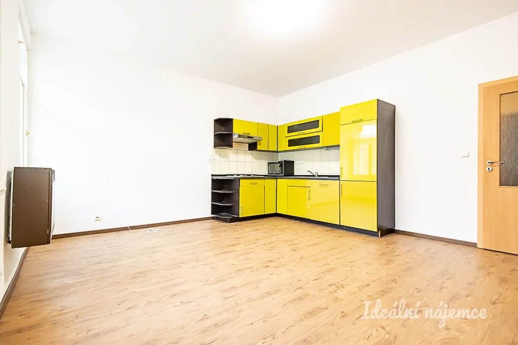 Dále je zde obývací pokoj společný s kuchyňským koutem. Kuchyně je zařízena plynovým sporákem, volně stojící troubou a digestoří. Dále se byt nabízí nezařízený. K dispozici je také lednice.