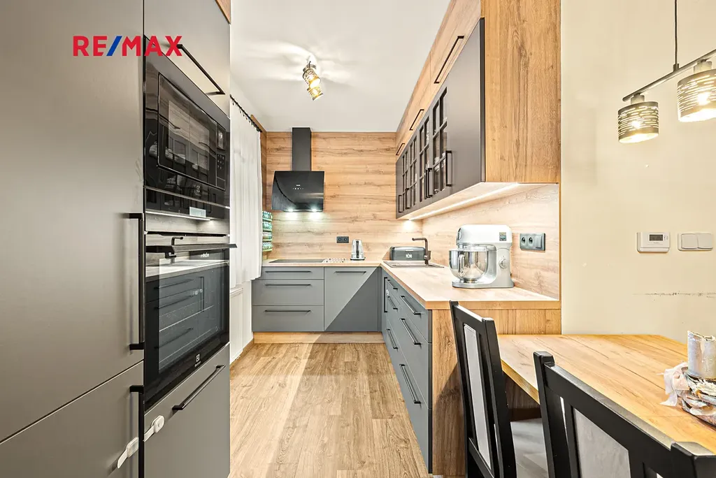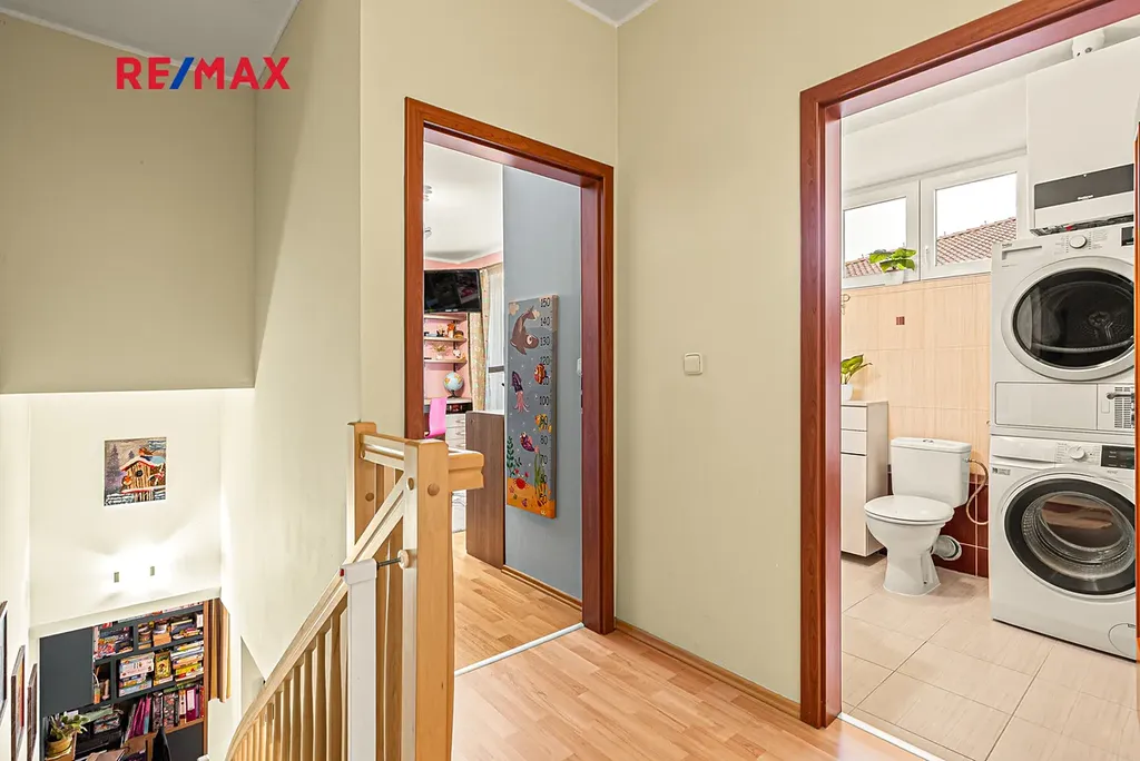 Byt je rozdělen do dvou pater (viz půdorysy ve fotogalerii): v 1.NP se nachází předsíň s vestavěnou skříní (3,04m2), samostatné WC (1,87m2), komora pod schodištěm (cca 2m2), obývací pokoj (31,50m2) se zdařile zrekonstruovaným kuchyňským koutem (6,15m2) s kvalitními vestavěnými spotřebiči. Z obývacího pokoje je vstup na terasu do udržované zahrady s příjemným posezením.