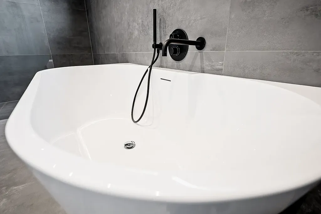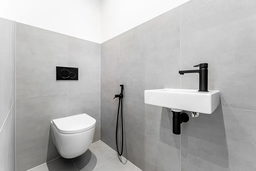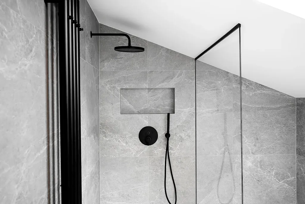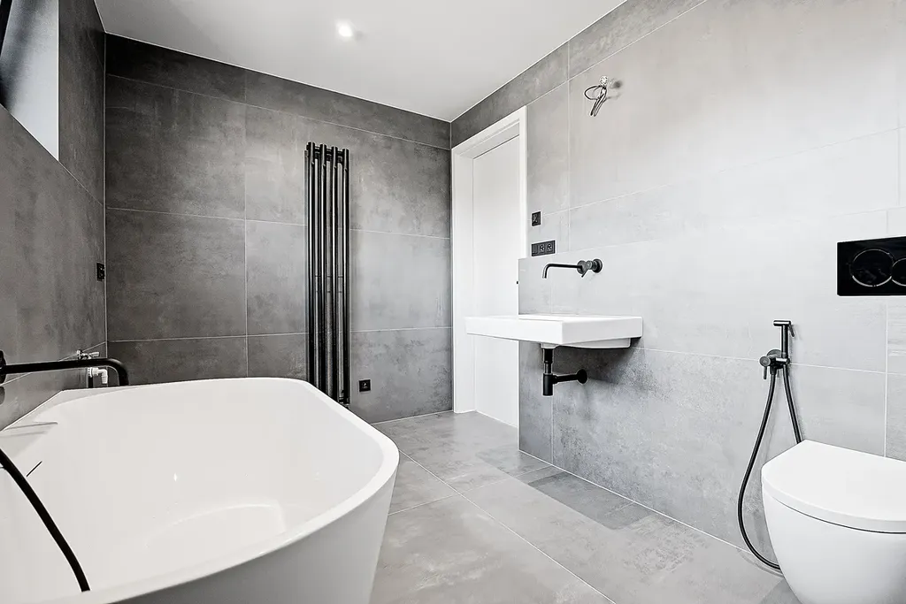 Koupelny s italskou velkoformátovou dlažbou a podomítkovými bateriemi působí elegantně, přitom funkčně.