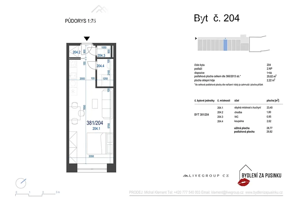 Nabízený moderní, částečně vybavený byt 1+kk (381/204) se nachází v 2. nadzemním podlaží dvoupatrového domu. Celková výměra bytu činí 29,82 m2, k bytu náleží praktická sklepní kóje 2,22 m2, parkovací stání pro automobil.