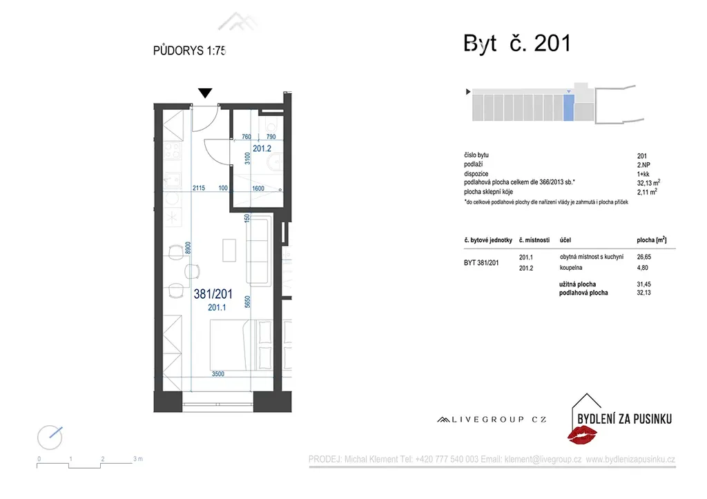 Nabízený moderní, částečně vybavený byt 1+kk (381/201) se nachází v 2. nadzemním podlaží dvoupatrového domu. Celková výměra bytu činí 32,13 m2, k bytu náleží praktická sklepní kóje 2,11 m2, parkovací stání pro automobil.