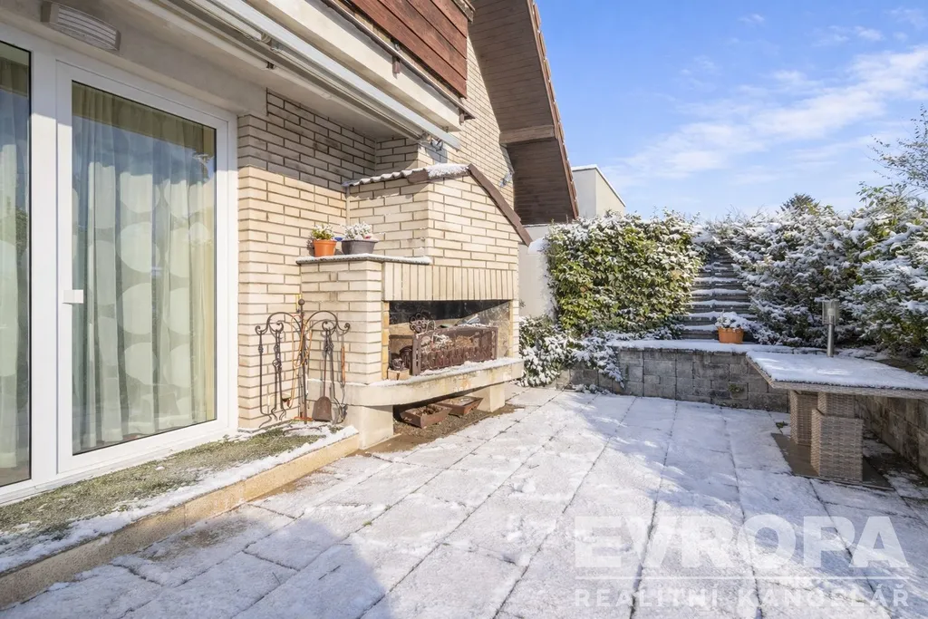 Vzrostlá zeleň a pozemku zajišťuje dostatek soukromí. Milou atmosféru dotváří venkovní krb, maximum komfortu potom vyhřívaný bazén se zastřešením.