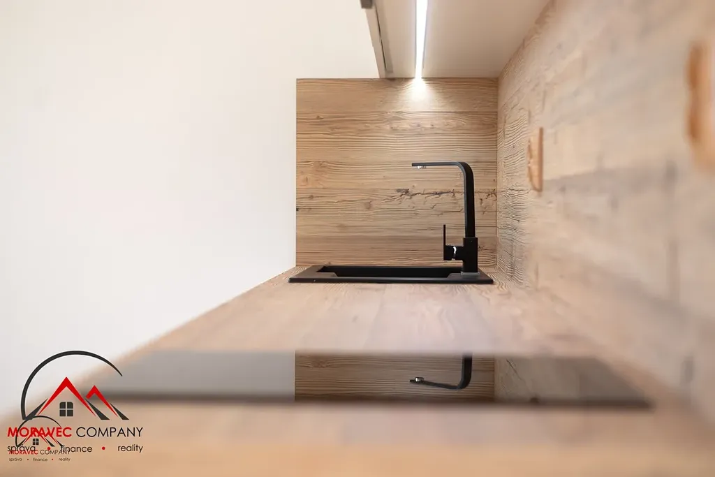 Vybavení bytu zahrnuje kuchyň s elektrickou troubou, indukční varnou deskou, digestoří, zabudovanou myčkou a mikrovlnnou troubou. Koupelna je vybavena sprchovým koutem a WC. Ohřev vody zajišťuje elektrický bojler.