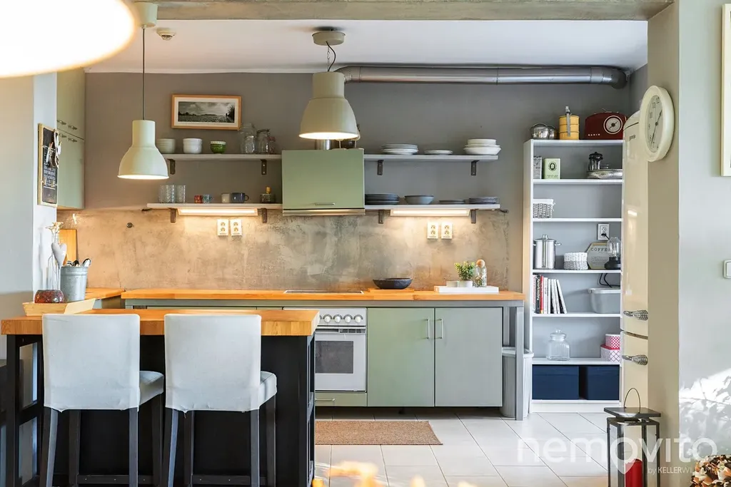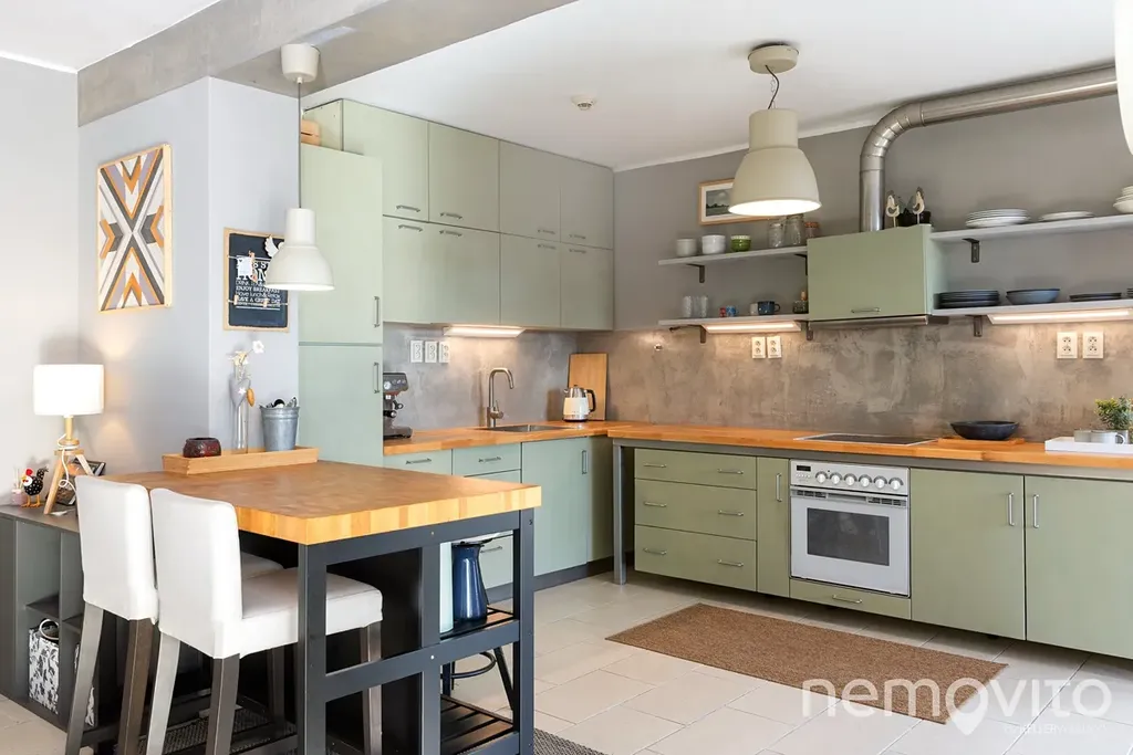 Dominantou bytu je obývák s kuchyní (dohromady 63 m2), který je díky jižní prosklené stěně mimořádně světlý a poskytuje skutečně dech beroucí výhledy do okolí. Díky umístění ve vyšším podlaží je výhled zcela volný, stíní pouze několik stromů. Prostorná rohová kuchyně je zejména v létě přímo spojená s první terasou, která je pohledově zcela otevřená do údolí a zároveň částečně krytá. Terasa je u bytu ještě jedna, a sice na druhou stranu (západ) - nyní je zde umístěna zimní zahrada/sklad.