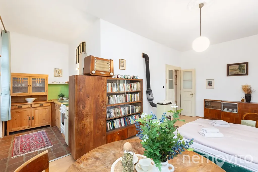 Hlavní část prvního podlaží tvoří velká společenská místnost s vysokým stropem. Její plocha je 65 m2 a kapacitně je s penzionem řešena tak, aby pohodlně pojmula 25 hostů. V hlavní místnosti je jídelní, kuchyňská a společenská část. Dřevo, cihly, kamna, původní okna a dveře - vše tak jak má být, pokud vy nebo vaši hosté hledají prostor, kde by se poctivá atmosféra starých časů dala i krájet. Nebo popíjet, což ostatně umožňuje malý vinný sklípek pod domem.