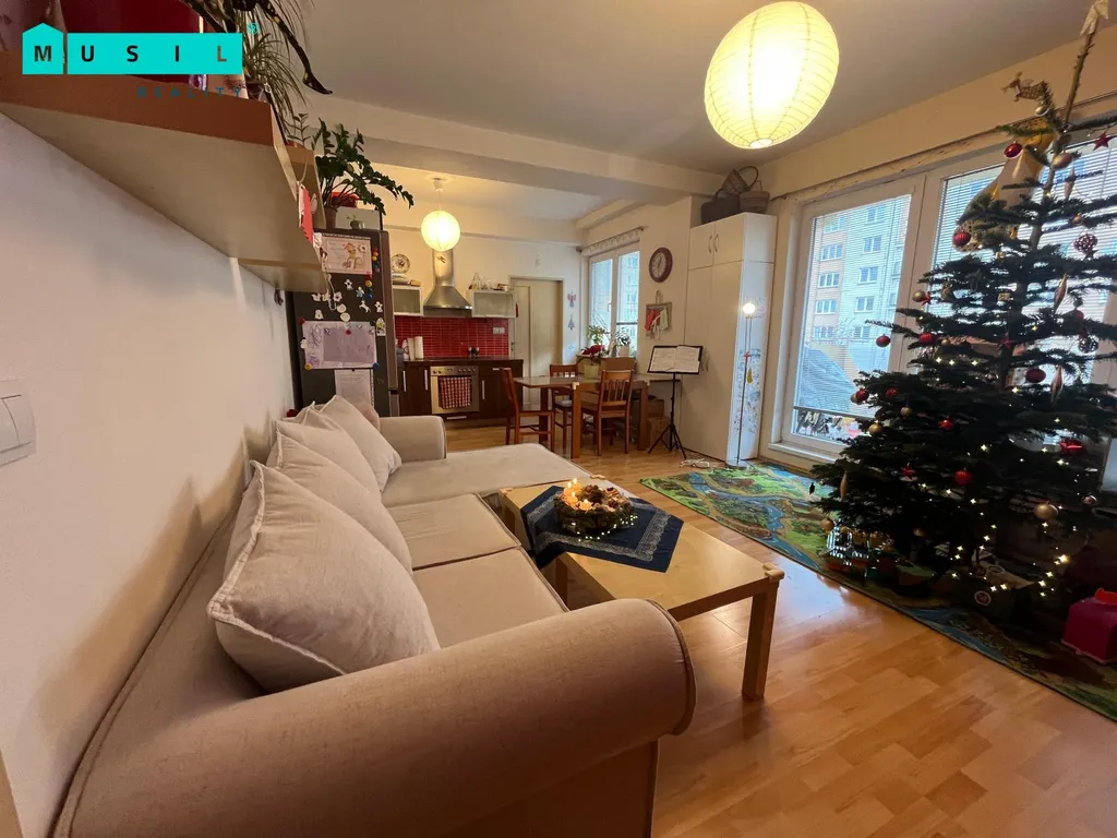 Součástí bytu je obývací pokoj s velkým francouzským oknem, televizí a přímým vstupem na terasu, dále kuchyňský kout s udržovanou kuchyňskou linkou vybavenou všemi spotřebiči, včetně elektrické trouby, varné desky, digestoře, myčky nádobí z roku 2021 a nové lednice s mrazákem pořízené v březnu 2025. K dispozici je také jídelní rozkládací stůl. Neprůchozí ložnice je vybavena manželskou postelí bez matrací. Koupelna s vanou prošla v únoru 2024 renovací, při které byly položeny nové obklady a dlažba, pračka není součástí vybavení. V předsíni se nachází velké vestavěné skříně se zrcadlem, které poskytují nadstandardní množství úložného prostoru.