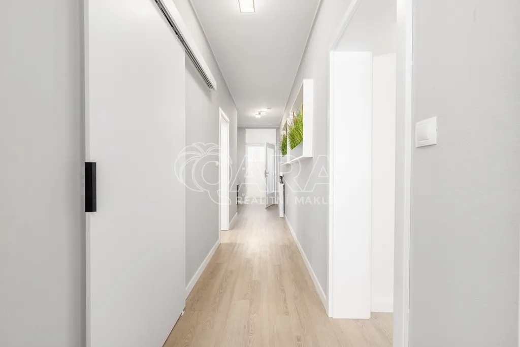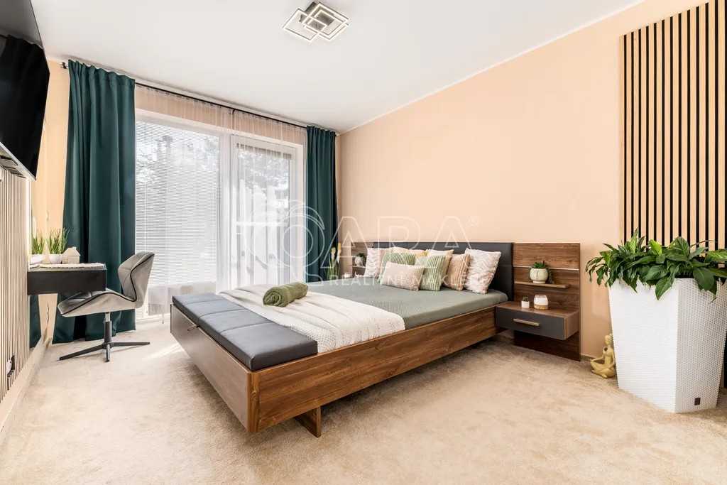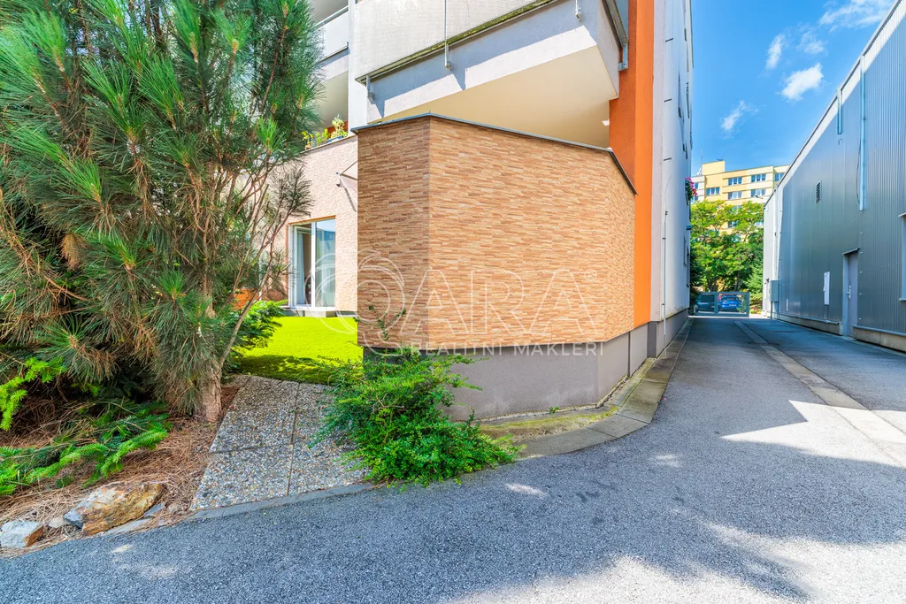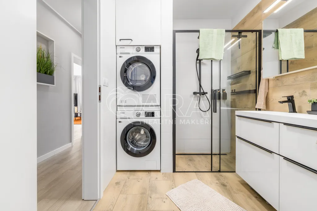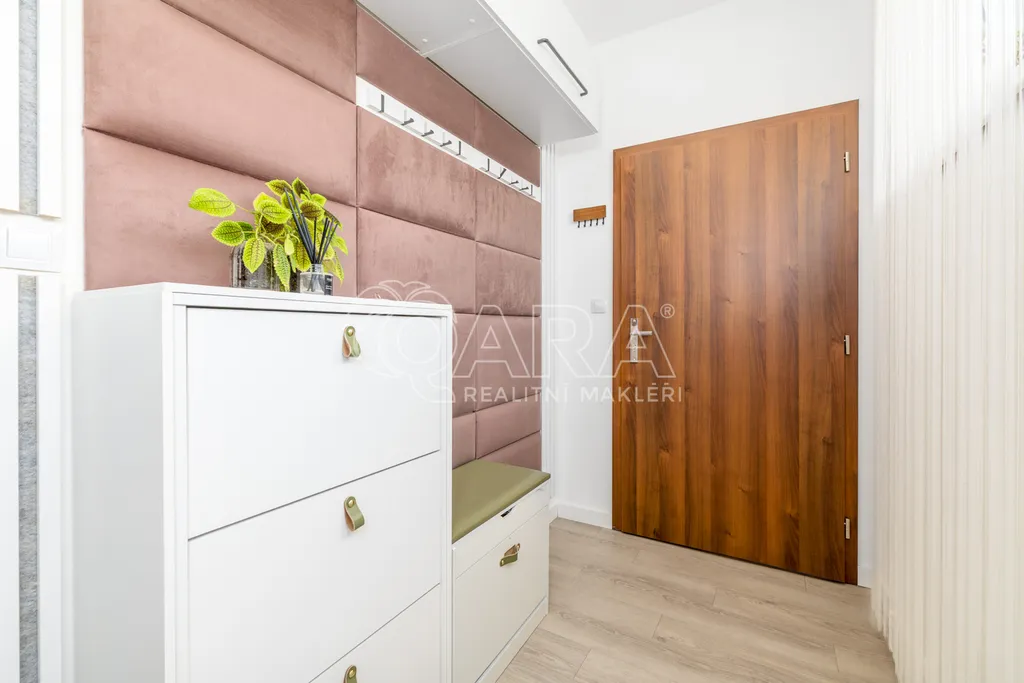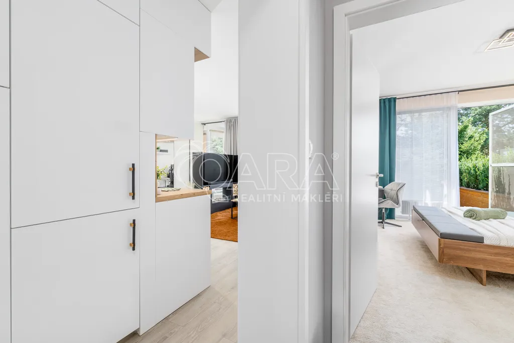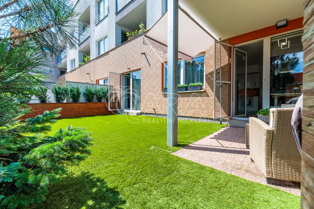 Byt prošel kompletní designovou úpravou a rekonstrukcí koupelny a disponuje vstupní chodbou, praktickou spíží, prostorným obývacím pokojem s moderní kuchyní, jídelním koutem a pracovním prostorem, ložnicí, šatnou a koupelnou s WC. Dominantou bytu je velká terasa o výměře 52 m² orientovaná na východ s možností umístění posezení, vířivky či sušení prádla. Z obou hlavních místností je přímý výstup na terasu. Součástí je také kolárna sdílená pouze se dvěma dalšími byty.