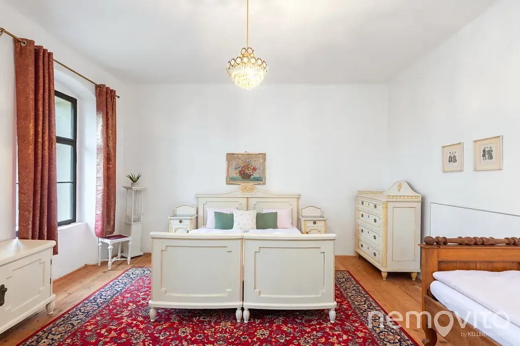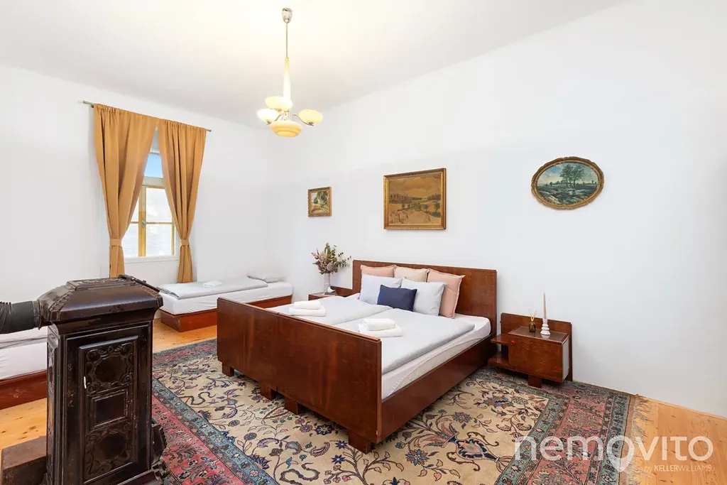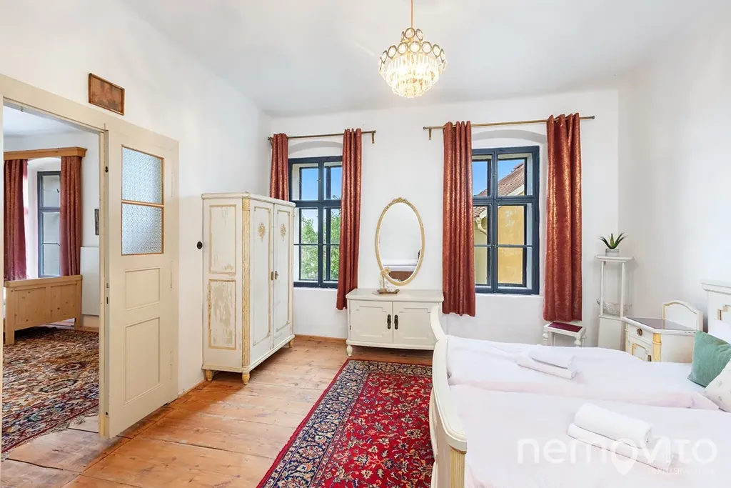 Pokoje jsou tematické, a tak tu naleznete zámecká apartmá, největší "prezidentský" pokoj (Zbraslavice jsou blízko Vysočině, ale ne zas tak moc), socialistický pokoj vhodný k plánování vašeho hospodářství nebo část domu, která je vhodná pro využití k bydlení - dva pokoje z vlastní koupelnou a kuchyní. Koupelny jsou v domě celkem 3, kuchyně mimo zmíněné pak ještě dole ve společenské. Pokoje mají od 16 do 36 m2.