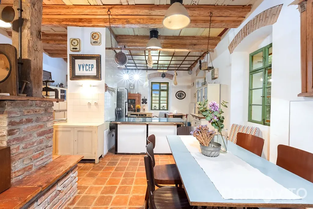 Hlavní část prvního podlaží tvoří velká společenská místnost s vysokým stropem. Její plocha je 65 m2 a kapacitně je s penzionem řešena tak, aby pohodlně pojmula 25 hostů. V hlavní místnosti je jídelní, kuchyňská a společenská část. Dřevo, cihly, kamna, původní okna a dveře - vše tak jak má být, pokud vy nebo vaši hosté hledají prostor, kde by se poctivá atmosféra starých časů dala i krájet. Nebo popíjet, což ostatně umožňuje malý vinný sklípek pod domem.