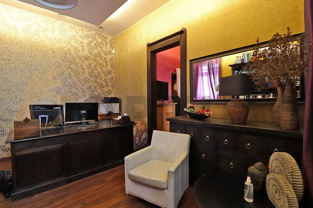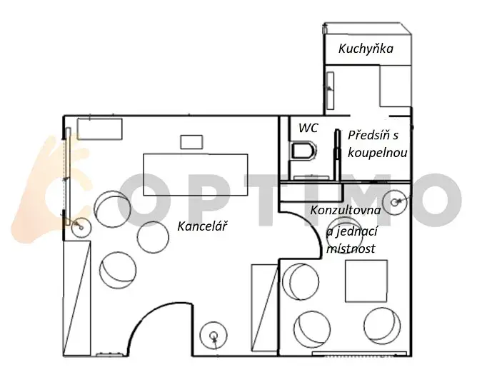 Jedná se o exkluzivní nabídku v cihlovém domě s vlastním vchodem přímo z ulice, který je v nadstandardním luxusním provedení. Prostor nabízí celkem 3 místnosti - hlavní kancelář/showroom 19 m2, na který navazuje zasedací místnost 11,8 m2. Na zasedací místnost vlastní toaleta s koupelnou a plně vybavená kuchyňka. Celý prostor má zlaté tapety a je vybaven nábytkem z masivního dřeva.