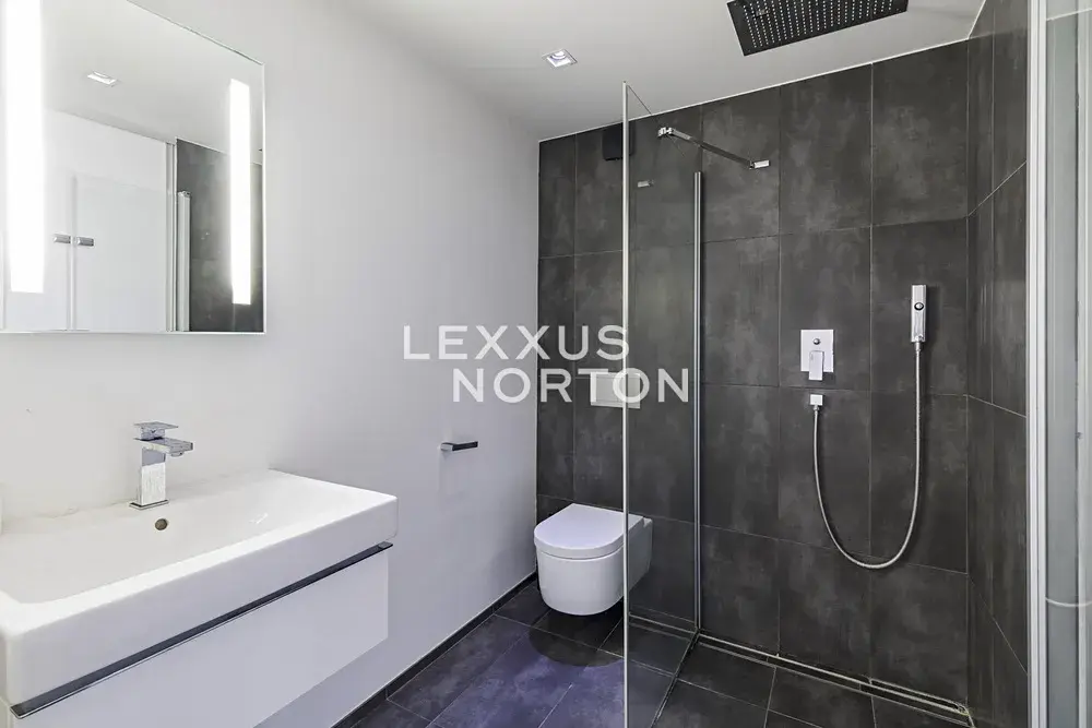 Moderní světlý mezonet s dispozicí 5+kk a celkovou plochou 192 m² splňuje všechny nároky na moderní a komfortní životní styl. Nemovitost se nachází na 5. nadzemním podlaží. Spodní úroveň bytu zahrnuje vstupní halu, světlý obývací pokoj s krbem, plně vybavený kuchyňský kout, dvě ložnice, dvě koupelny a praktickou šatnu. Na vyvýšené galerii se nachází další ložnice, koupelna a kompaktní místnosti sloužící jako úložné prostory. Z galerie máte přístup na prostornou terasu, odkud se vám nabízí dechberoucí pohled na město i do klidného vnitrobloku plného zeleně. Byt je plně klimatizován a vybaven inteligentní domácností.