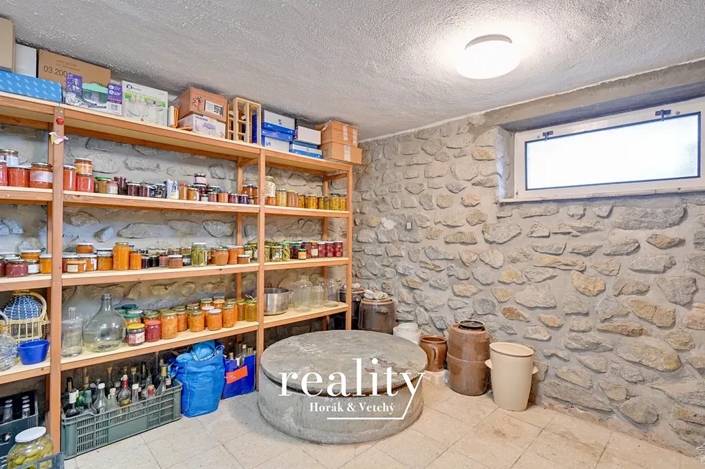 V suterénu najdete prádelnu se sprchou a saunou, velký kamenný sklep, další místnost a průjezdnou garáž. Na zahradě je bazén vyžadující modernizaci a ovocné stromy poskytující příjemný stín.