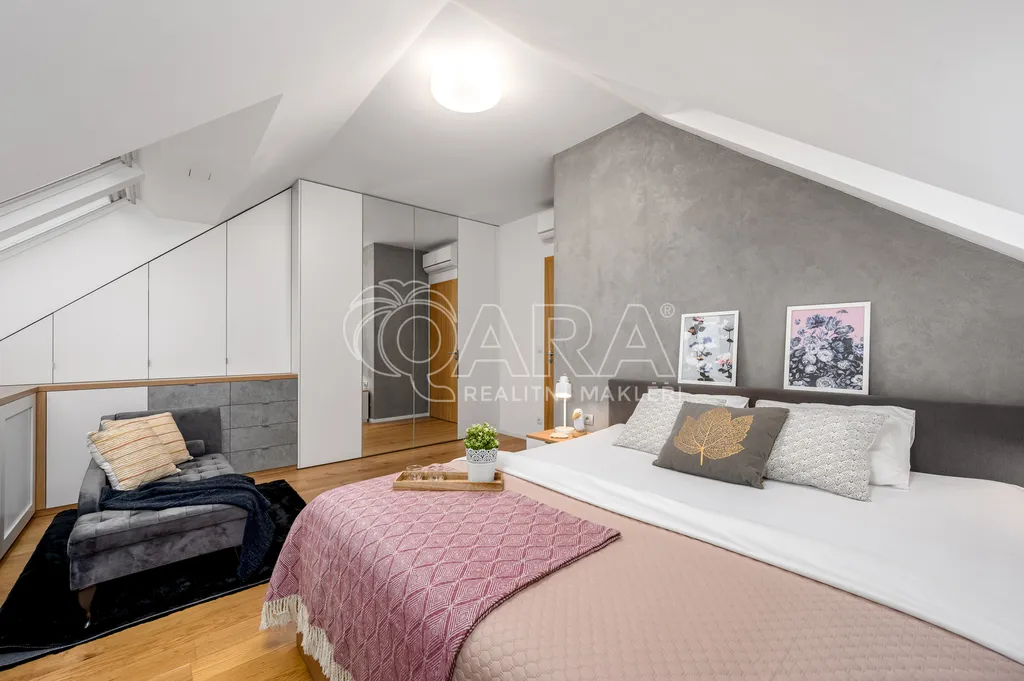 Na první pohled vás zaujme právě jeho otevřený prostor a příjemný charakter. To vše podporují citlivě zvolené materiály a důraz na moderní technologie s prvky chytré domácnosti. S ohledem na umístění v posledním patře se šikminami byl také kladen důraz na praktické řešení úložných prostor, které funkčně i esteticky dotváří praktičnost celého bytu.