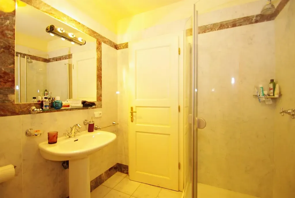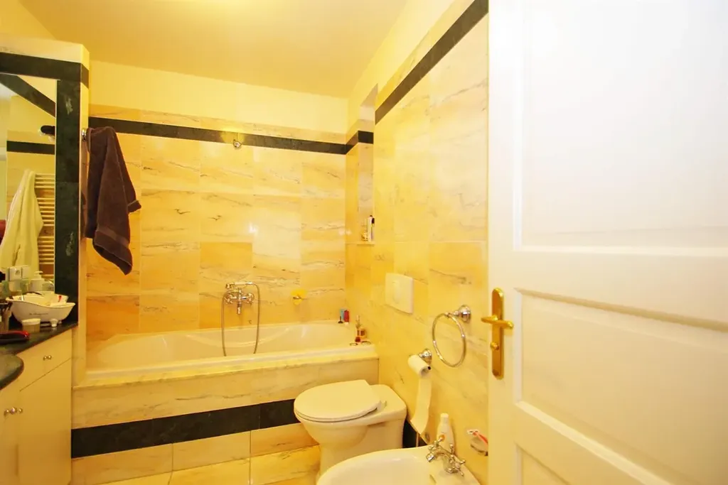 Interiér bytu dispozičně nabízí vstupní chodbu, prostorný obývací pokoj s balkónem, dále se vstupem do kuchyně vybavené spotřebiči (lednice s mrazákem, myčka, plynový sporák, trouba, mikrovlnná trouba). V protilehlé částí bytu jsou situované dvě samostatné ložnice orientované do vnitrobloku a dvě koupelny. Jedna z ložnic disponuje balkonem a vlastní koupelnou s vanou, toaletou a bidetem. Druhá koupelna má samostatný přístup a je vybavena sprchovým koutem, toaletou a bidetem. Součástí bytu je i samostatná prádelna s pračkou a sušičkou a samostatným topným systémem. Nábytek na fotografiích se může mírně lišit od skutečného stavu.