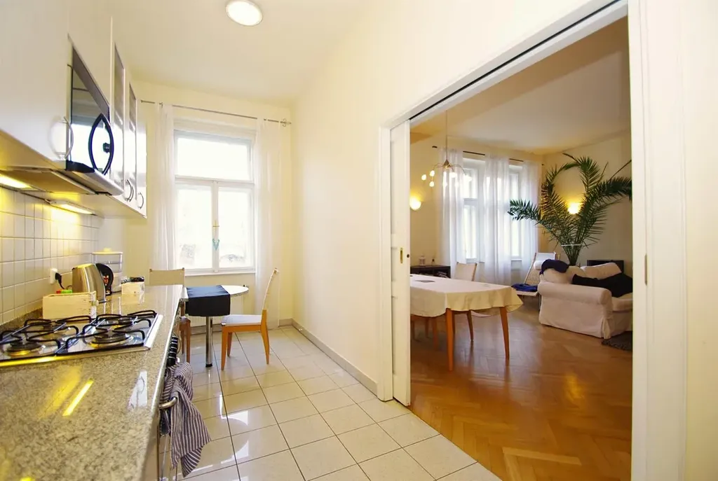 Reprezentativní zařízený prostorný byt 3+1 (2 ložnice, 2 koupelny) s celkovou plochou 100m2, se dvěma balkony a výhledem do parku, je situovaný ve 3. patře zrekonstruovaného rezidenčního domu s výtahem, a s možností využití společné zahrady ve vnitrobloku, který se nachází v oblíbené lokalitě u parku Riegrovy Sady, v ulici Polská, Praha 2 Vinohrady.